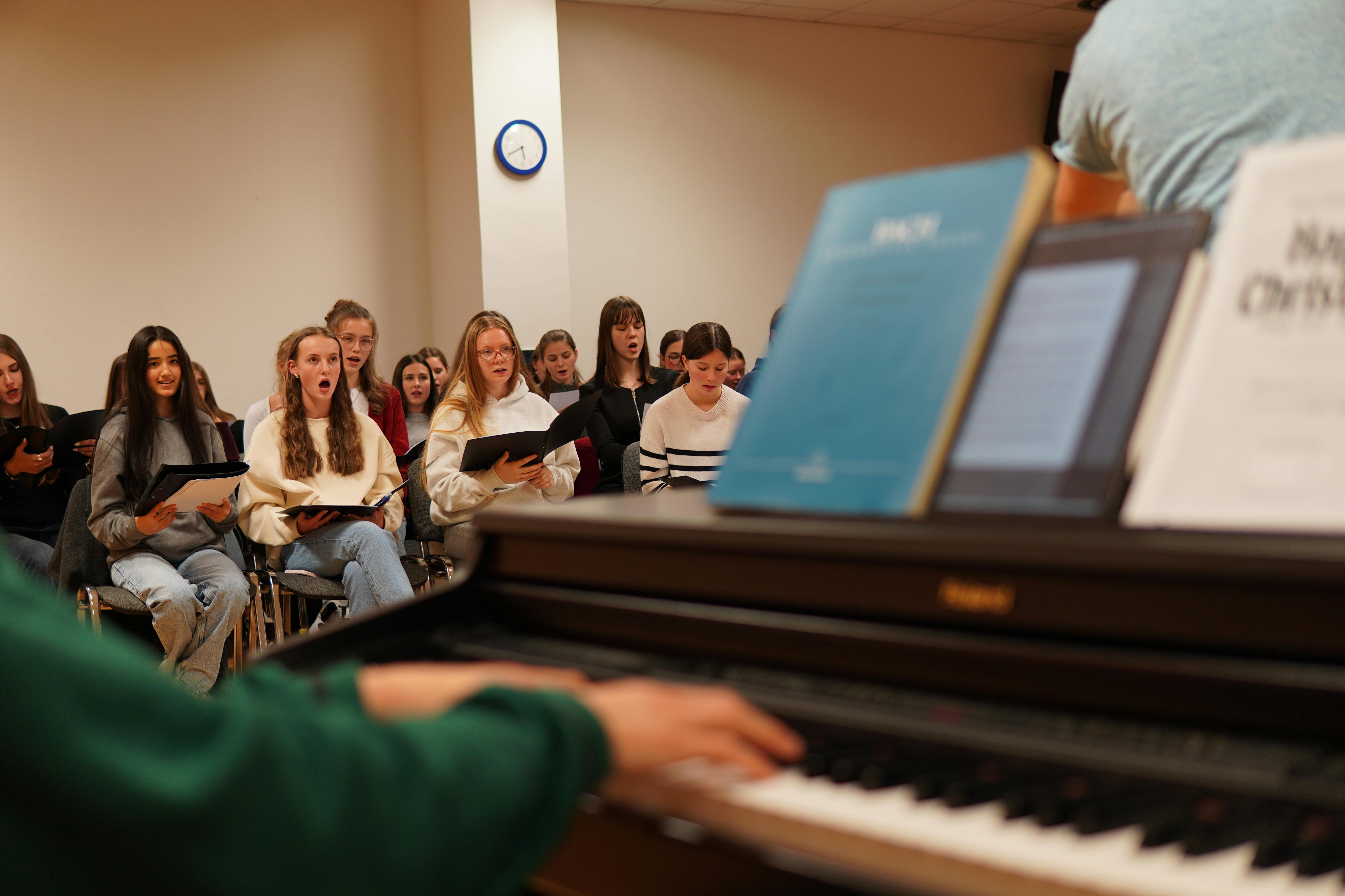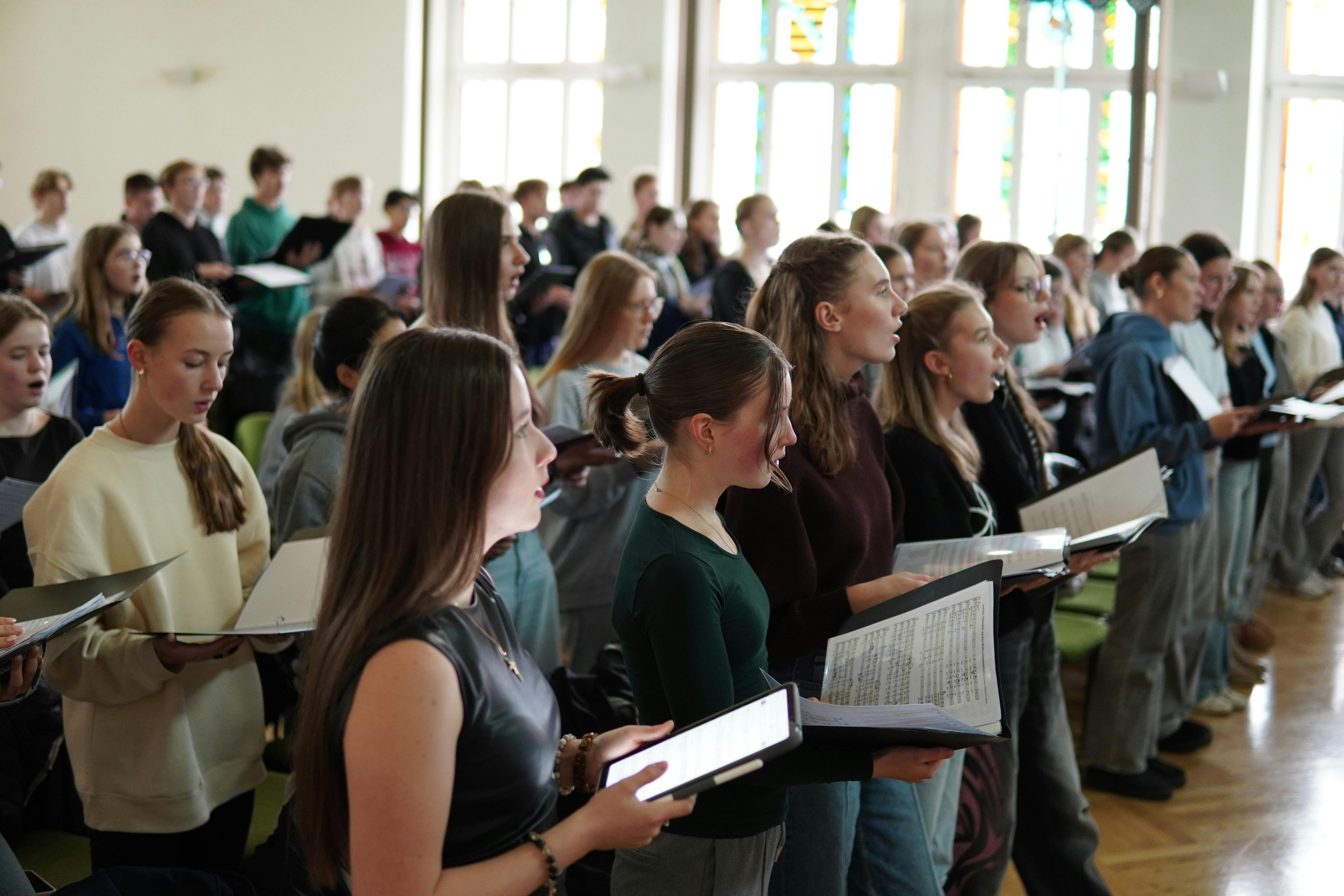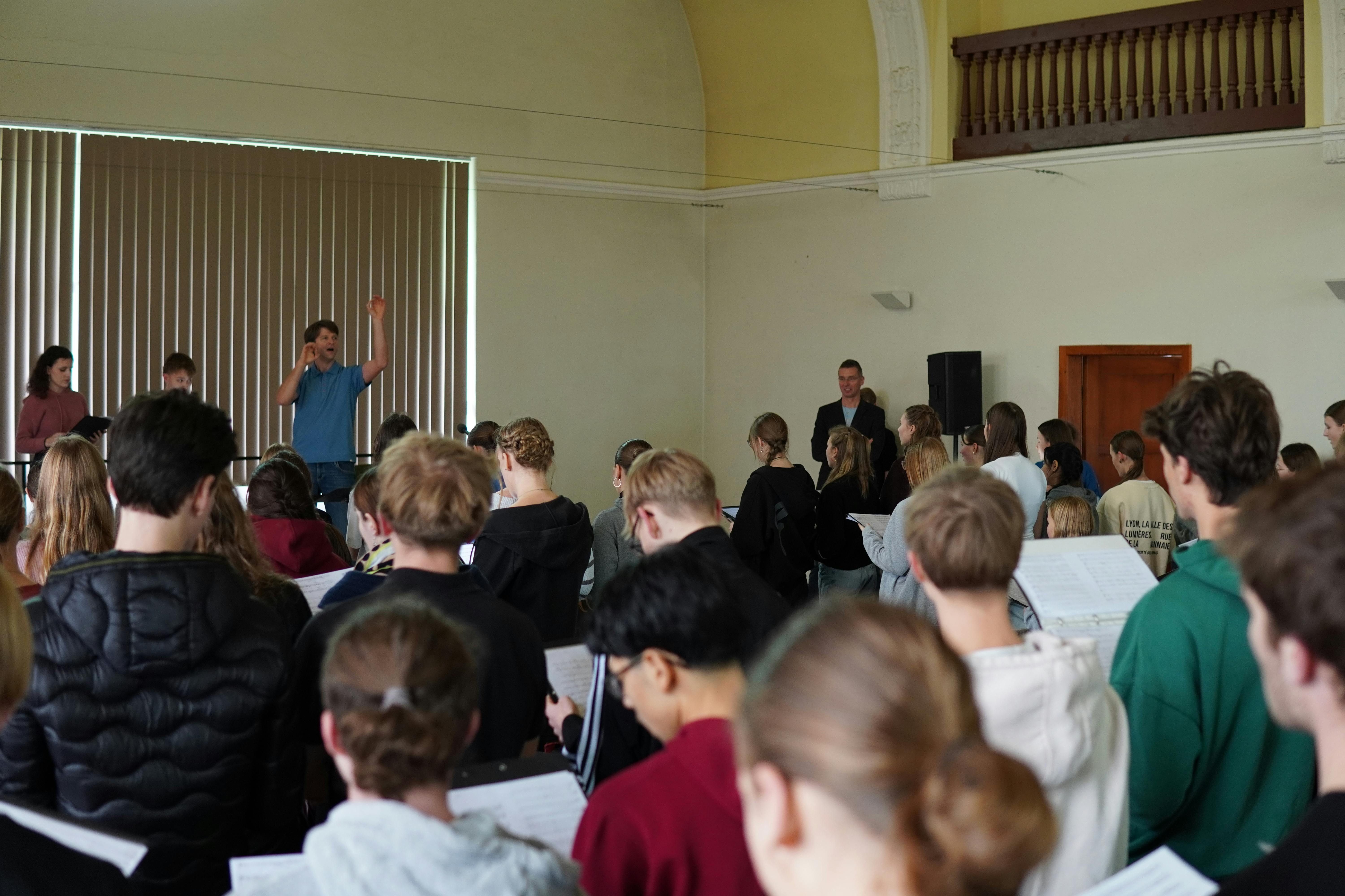 Wir wurden herzlich empfangen und in die Aula geführt, wo wir für Herrn Clausnitzer ein Lied aus unserem neuen Weihnachtsrepertoire sangen. Die Überraschung ist definitiv gelungen – es war ein kurzer, aber emotionaler und schöner Besuch.